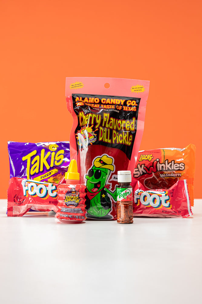 Indulge in this unique and fun snack with the Pepinillo Loko Cherry Big Tex - Pickle Bag Edition. Featuring a delicious Alamo cherry pickle and a variety of tangy and spicy snacks like Tajin, Lucas, and Takis, this pickle bag is sure to satisfy all your cravings. A quirky and playful snack experience that will leave you wanting more (but watch out for those Roll-Ups!).